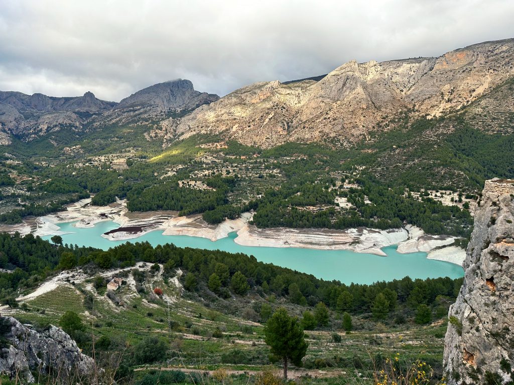 Hidden deep in the Aitana range, Guadalest sits on a rocky spur above its reservoir. The approach is steep and winding, with wide views over the valleys and ridges of inland Alicante. Small and quiet, the village marks a natural midpoint between the high passes and the descent toward the coast.