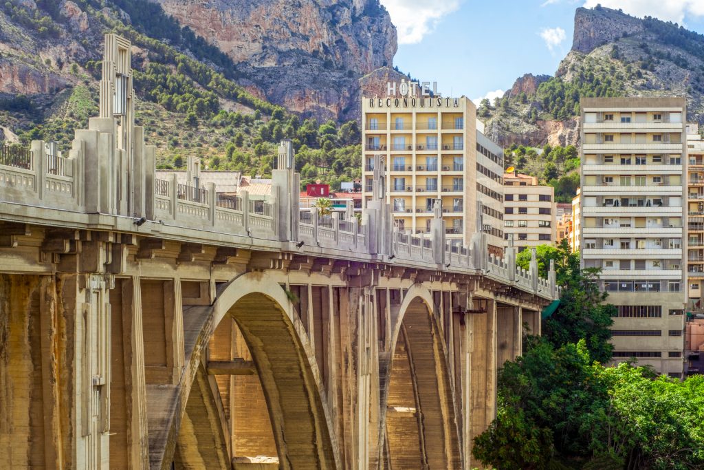 Alcoi lies in a deep basin between the Sierra de Mariola and the Sierra de Aitana. The town is surrounded by high ridges and crossed by bridges linking its steep districts. From here, the route leads into long, winding climbs through forests and exposed mountain roads — a demanding section at the heart of inland Alicante.